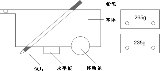 先將試片和儀器置於測(cè)試平臺(tái)上,選擇硬度適當(dāng)?shù)你U筆,削除鉛筆木質(zhì)部分,使筆芯露出約3mm長(zhǎng)將鉛筆芯在砂紙上成45度角研磨平,使鉛筆前端面平坦邊角銳利,此時(shí)即可將鉛筆插入45度孔內(nèi)(水平板平放機(jī)臺(tái)下確保水平),使筆尖著落于試片前端,再用本體側(cè)面螺絲鎖定鉛筆.然后用手推動(dòng)儀器平行移動(dòng)約3-6㎝(推速約1.0㎝/s),取下試片將筆尖犁痕擦試干凈.若目視無刮傷痕跡,則再選擇硬一級(jí)鉛筆(若有刮痕,則選擇軟一級(jí)鉛筆),再試之,依次類推.