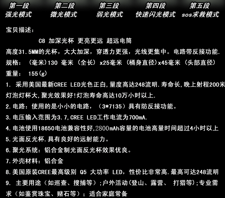 套裝包括:正品Q5燈炮,C8五檔手電筒1只,充電器一個(gè),明珠品牌18650充電鋰電池2800豪安+備用18650鋰電池<共兩個(gè)電池>,手繩一條。