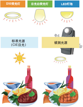 除了熒光燈,近LED(發(fā)光二極管)也已被用作照明燈。物體在這些光源下顯示的色貌與其在自然光下原色貌進行比較,兩者的接近程度就是光源的"顯色性"。