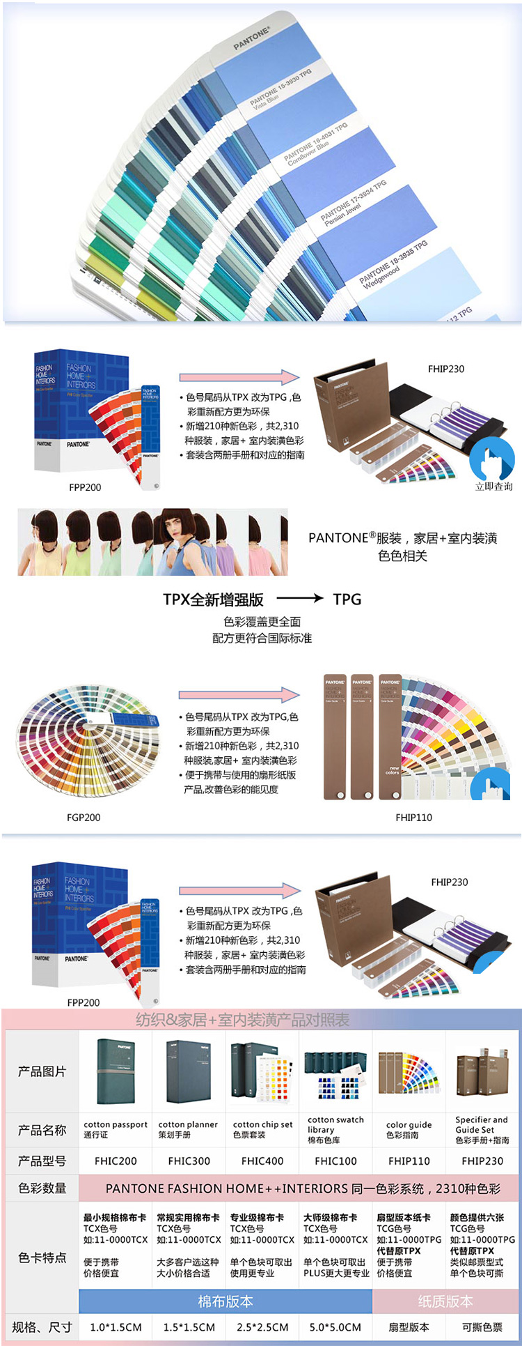 原TPX色彩指南升級(jí)為新的名稱TPG色彩指南(但仍保持與原有TPX后綴版相同的色彩完整性),在原來(lái)2,100種顏色基礎(chǔ)上,2016年3月新增210種新色彩,全套2,310種顏色,迄今顏色更多全的產(chǎn)品,本套裝包含兩本書(shū)形可撕色票,單頁(yè)便于取出,顏色也可供撕出達(dá)六次之多,另包含一本便攜式色彩南,扇形版本,方便于查色及外帶,應(yīng)用于:服裝,紡織,家居,室內(nèi)外裝潢,使用行業(yè)多,是一款值得推薦的產(chǎn)品.