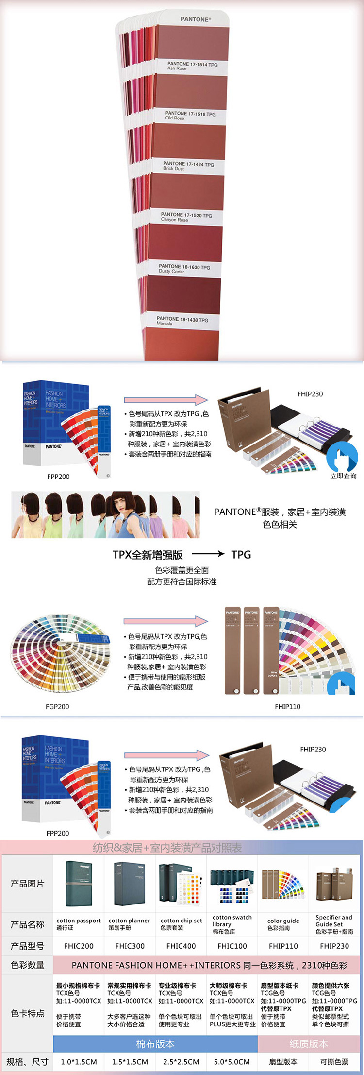 原TPX色卡升級為新的名稱TPG色彩指南(但仍保持與原有TPX后綴版相同的色彩完整性),在原來2,100種顏色基礎(chǔ)上,2016年3月新增210種新色彩,全套2,310種顏色,應(yīng)用于:服裝,紡織,家居,室內(nèi)外裝潢,使用行業(yè)多,是一款值得推薦的產(chǎn)品.