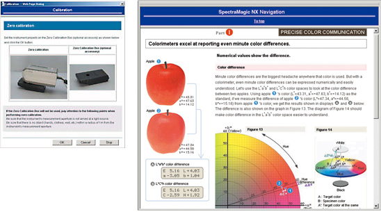 通過附加的導(dǎo)航功能,您可以采用在線逐步指示(包括圖解)完全控制整個操作流程。 此種獨特的特性可由用戶按照需要進(jìn)行自定義。 SpectraMagic NX導(dǎo)航窗口同樣包括HTML版本“精確的色彩交流”的鏈接,其中包含的圖示和說明使得用戶對于色彩和色彩測量技術(shù)相關(guān)的基礎(chǔ)知識和技術(shù)項目有了更加清晰的了解。