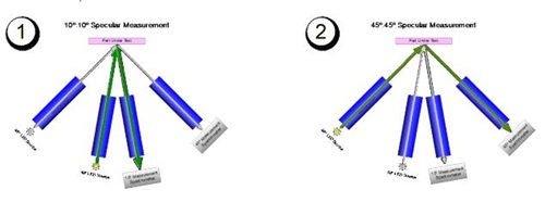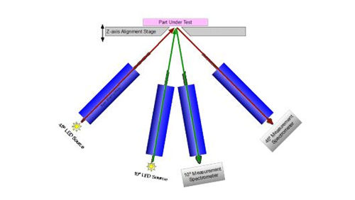 為了測量光滑光亮表面的直接鏡面反射,fd-ma1045il依次用10度LED光源照明,用10度測量光譜儀捕捉,然后用45度LED光源照明,用45度測量光譜捕捉。儀表。使用三級測量分光計(jì)進(jìn)一步補(bǔ)償這些測量值,以校正光照的微小變化。
